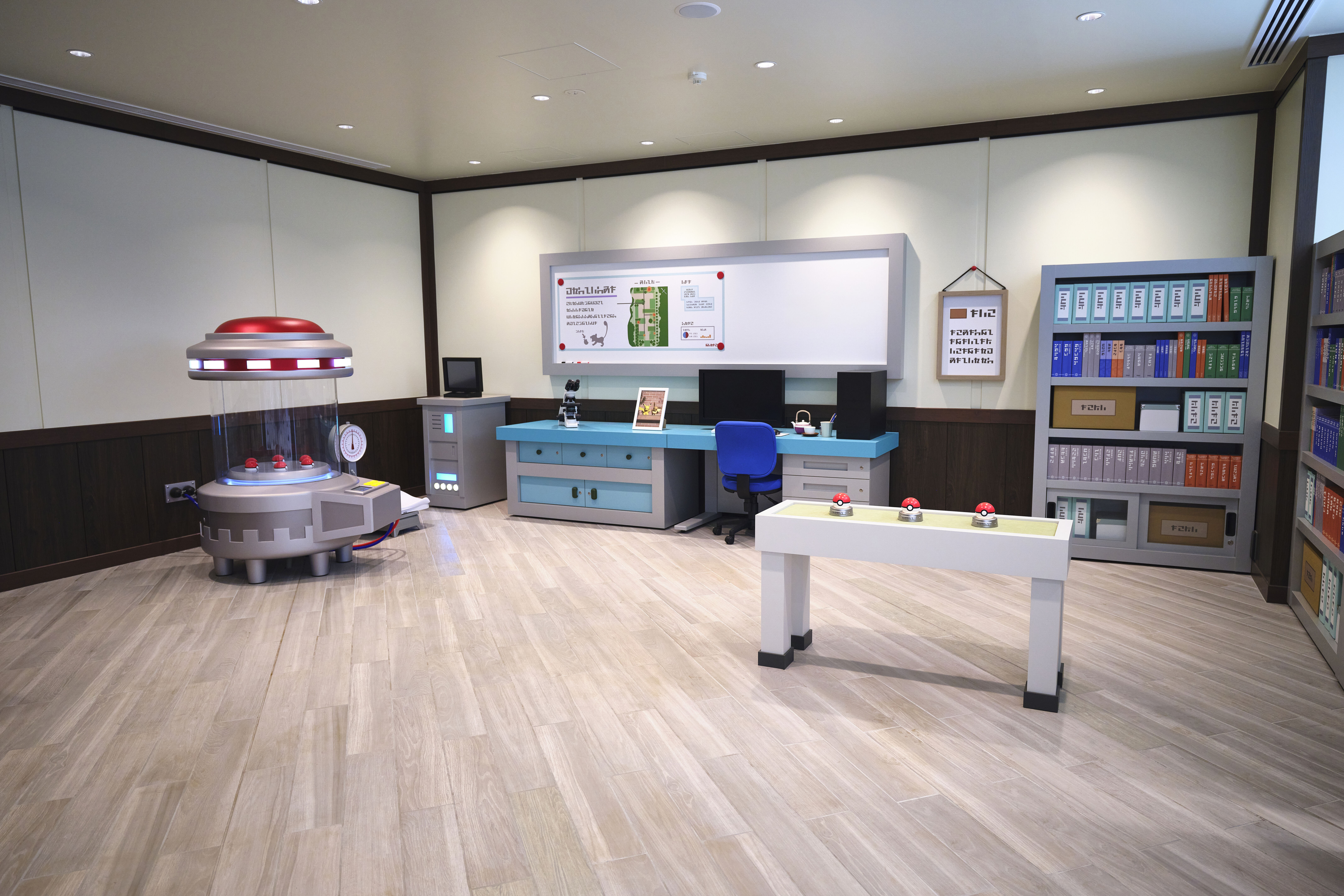 The professor’s research lab is the queue area to enter the Pokémon Forest, but it is also a visual attraction in itself. Modelled after Professor Oak’s lab, it contains life-size props of the machines and furniture found in the game. The professor’s research lab gives us the first taste of the design style that PokéPark Kanto is going for.