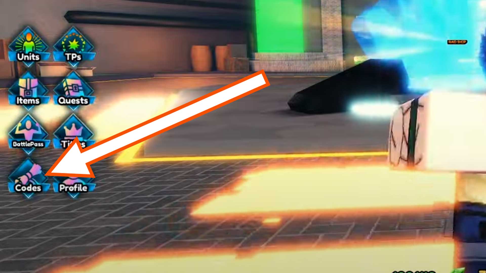 A screenshot with an arrow pointing to the Codes menu in Anime Last Stand.