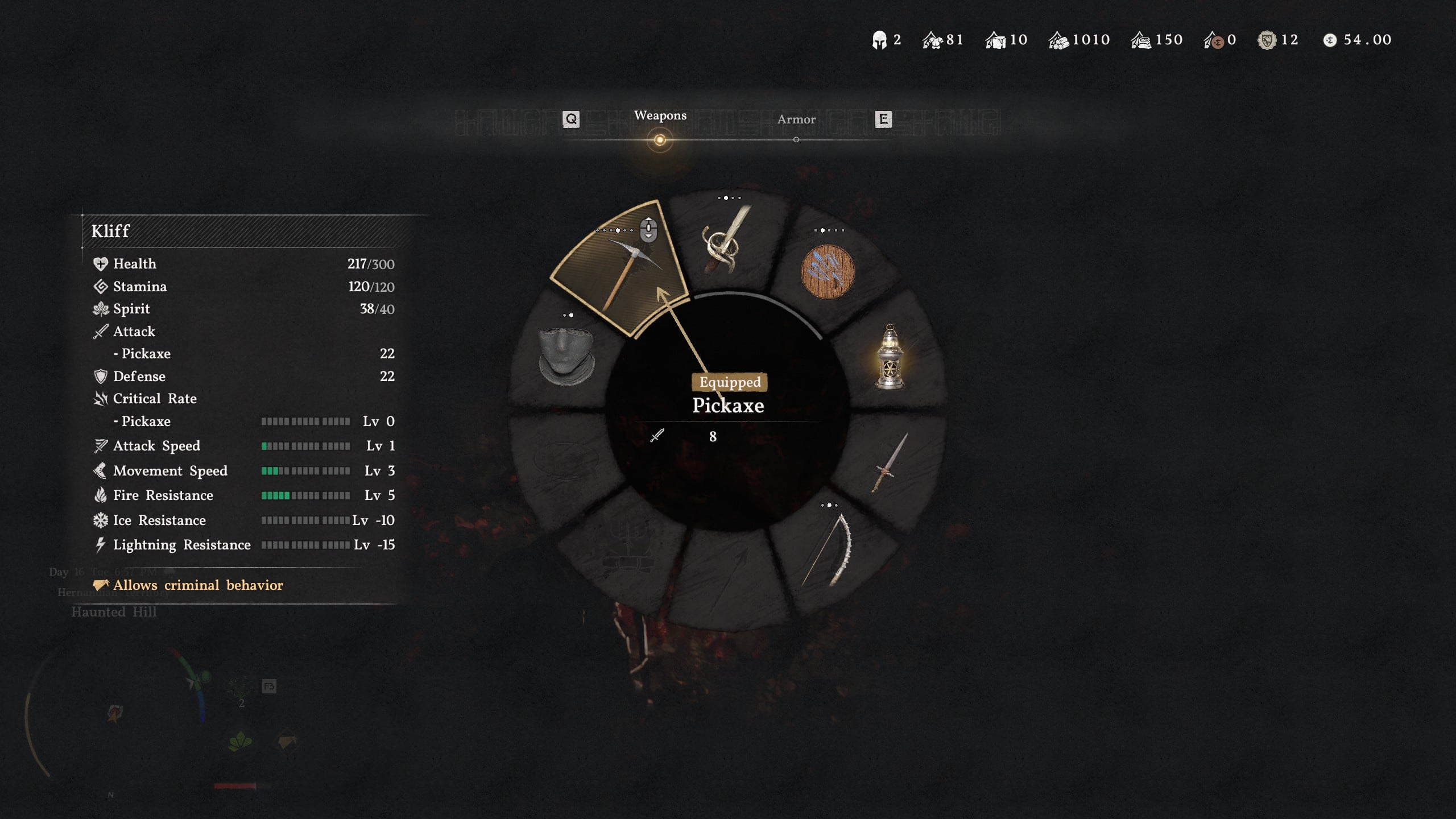 To mine ore, you’ll need a Pickaxe in your inventory and equipped. You can then hold Left on the D-Pad and scroll through your two-handed tools with LT and RT to select your Pickaxe.