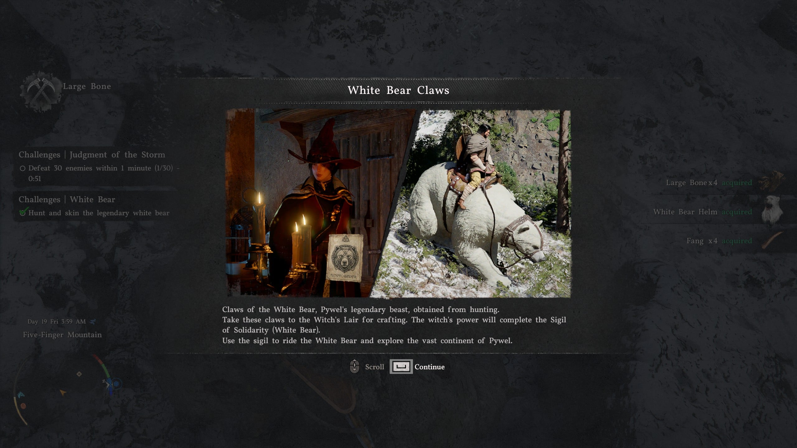 The White Bear will fight back, of course, but as long as you don’t get hit in a combo, you should be able to survive and take down the White Bear. You’ll earn the White Bear Claws as a reward, which you can take to Elowen at the Witch’s Lair to get the White Bear as a mount.