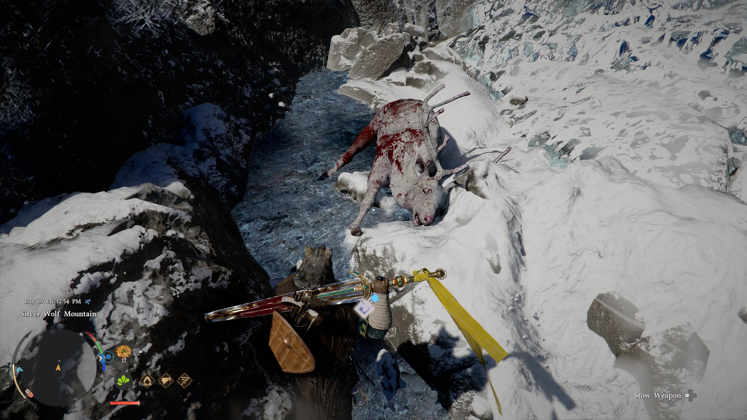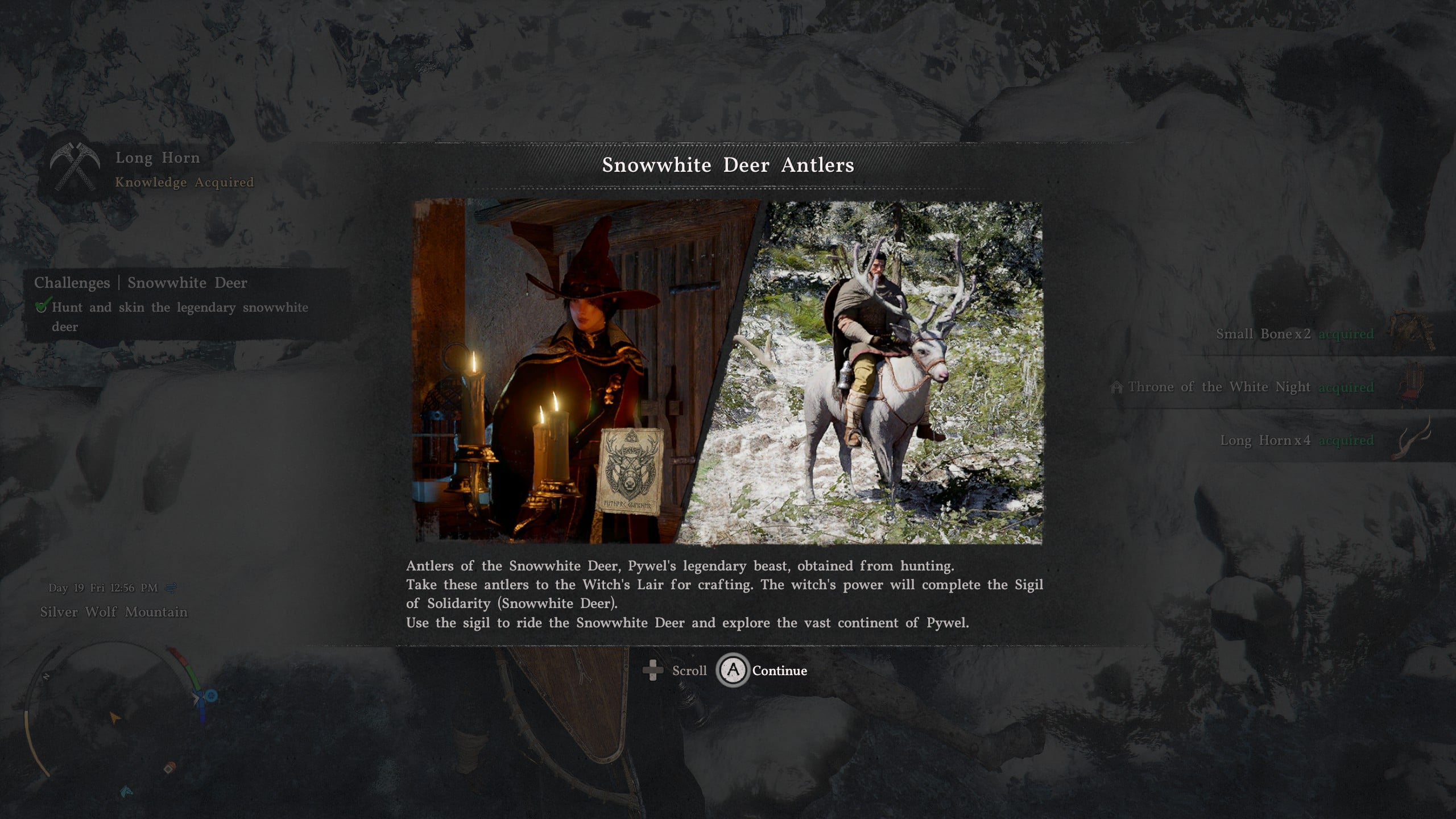 Make sure you come with arrows in your pack, as hitting it with an arrow is the only way to slow the beast unless you can corner it against the mountain rocks. It has a decent amount of health, but if you continue hitting it with combo attacks, it should stagger enough for you to take it down. You’ll earn the Snowwhite Deer Antlers as a reward, and as with the White Bear, you can take this to Elowen to permanently earn the Snowwhite Deer mount.