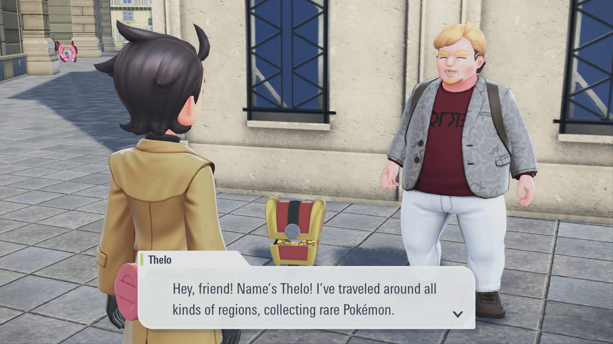 He offers you Gimmighoul, a Pokémon from the Paldea region, on the proviso that you raise the Pokémon for him, and evolve it.