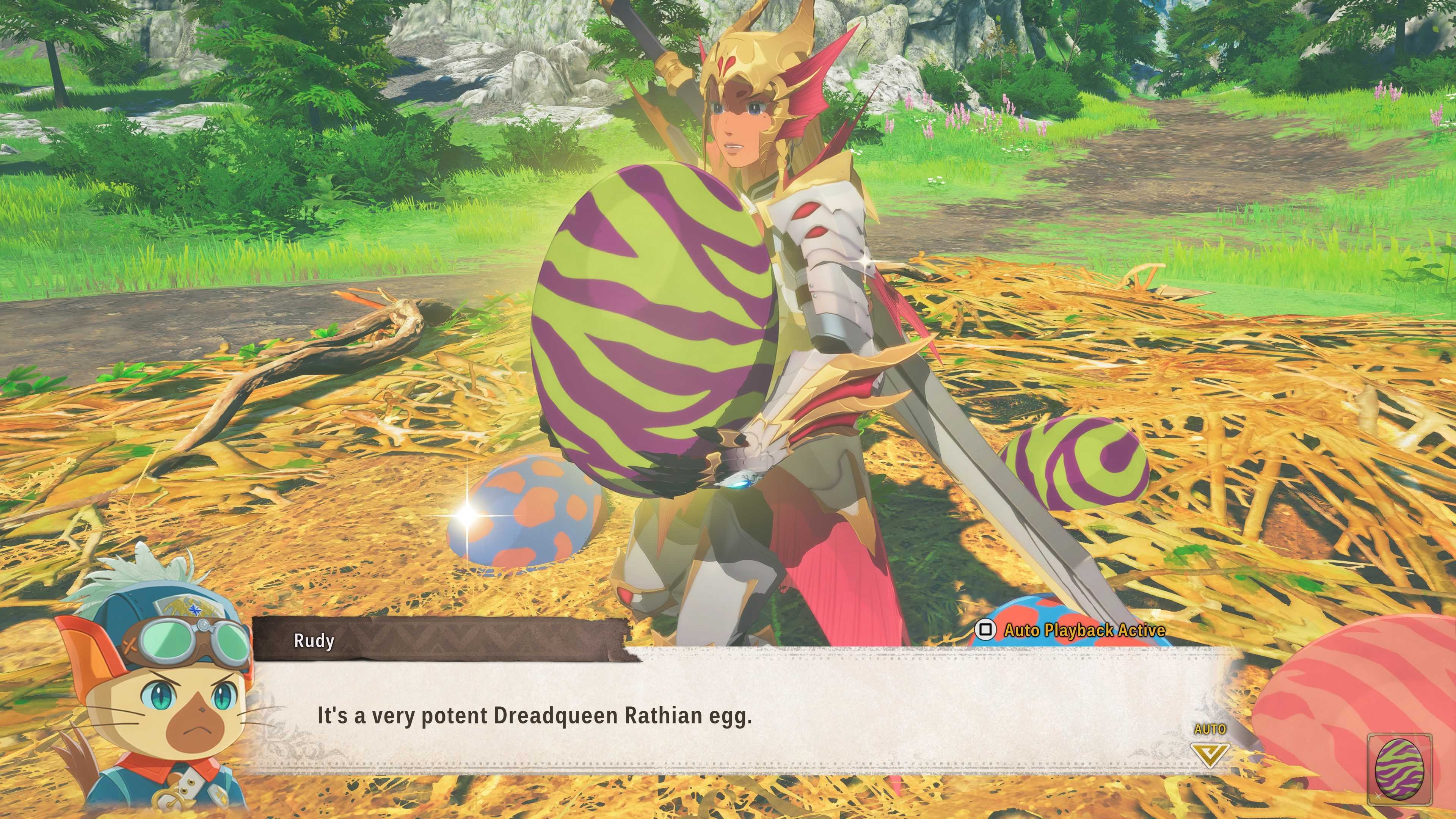 Now that you’ve reintroduced Rathian into the Sunpetal Plains, it’s time to find its eggs. Explore the Sunpetal Plains Monster Dens, and you’ll eventually find Rathian eggs. You’ll need to collect at least four Rathian eggs.