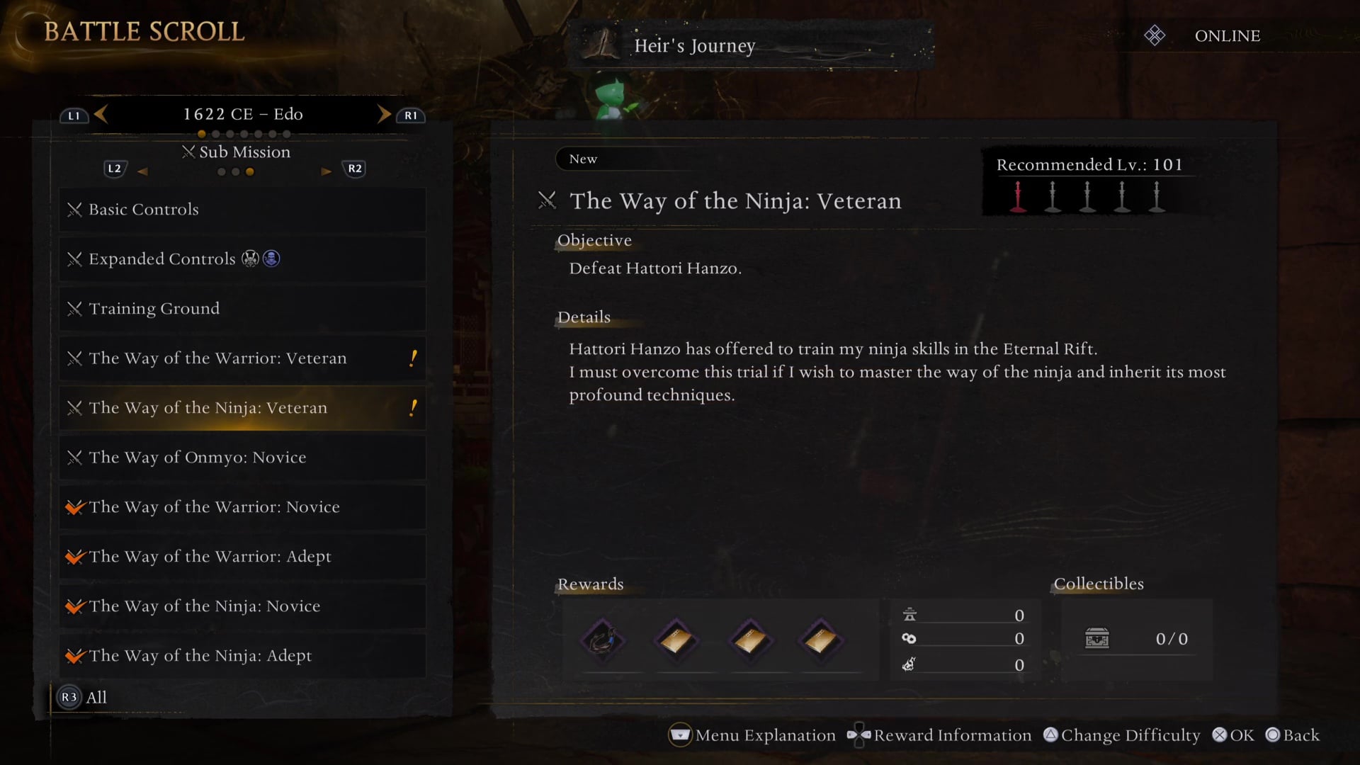 As you progress through the game, Munenori and Hanzo will appear in the Eternal Rift to speak with you, and after speaking with them, they’ll gift you with new Battle Scrolls you can find under 1622 CE – Edo. Titled The Way of the Warrior and The Way of the Ninja, each Battle Scroll has three variants that increase in difficulty from Novice, to Adept, and finally Veteran.