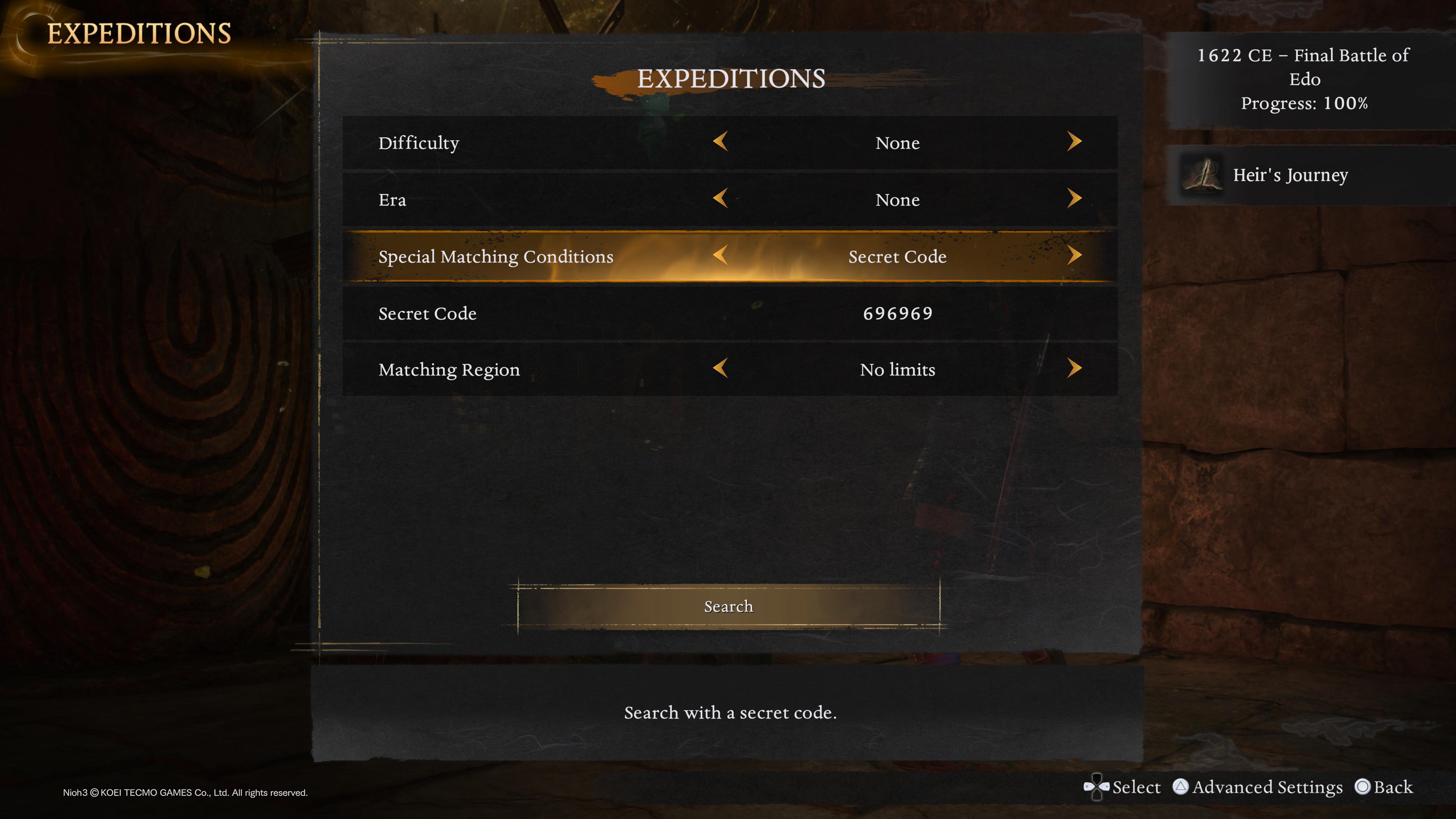 When searching for your friend, it’s best to leave most options on their defaults and just change the Special Matchmaking Condition to “Secret Code”. This will enable the Secret Code field, and you must enter the same six-digit number that the person creating the room has specified.