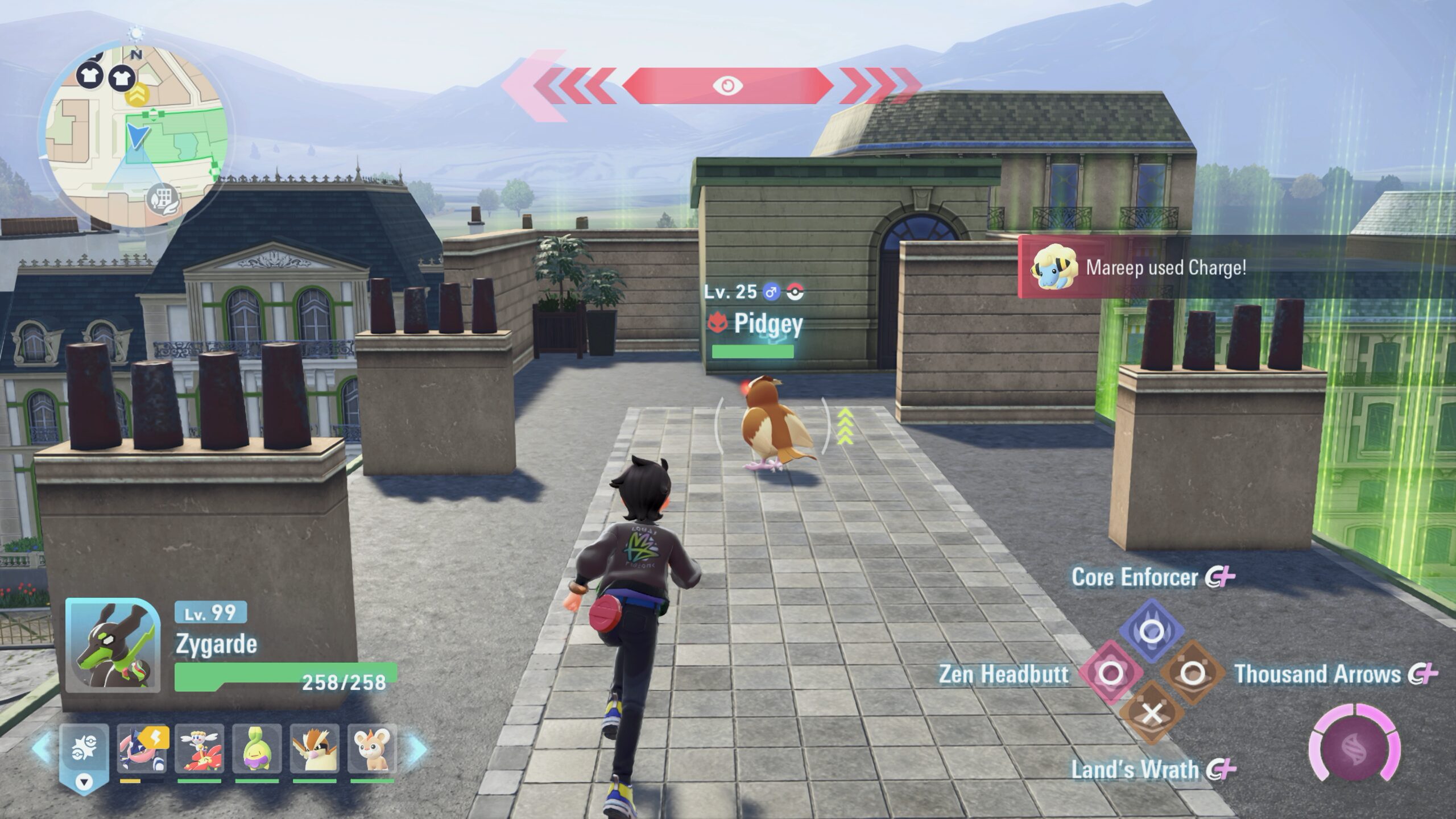 Wild Zone 1 contains several Alpha Pokémon. Alpha Pidgey appears at the far end of the rooftops, above where Pichu is. This Alpha Pidgey is level 25, making it by far the highest level Pokemon in Wild Zone 1.