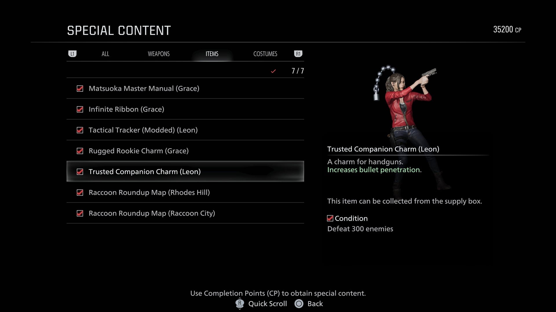 After you’ve cleared the game once, you’ll be able to earn the Trusted Companion Charm from the Special Content shop, and all you need to do is defeat 300 enemies — which you’ve probably already done. It’s a nice little plastic charm of RE2’s Claire Redfield.