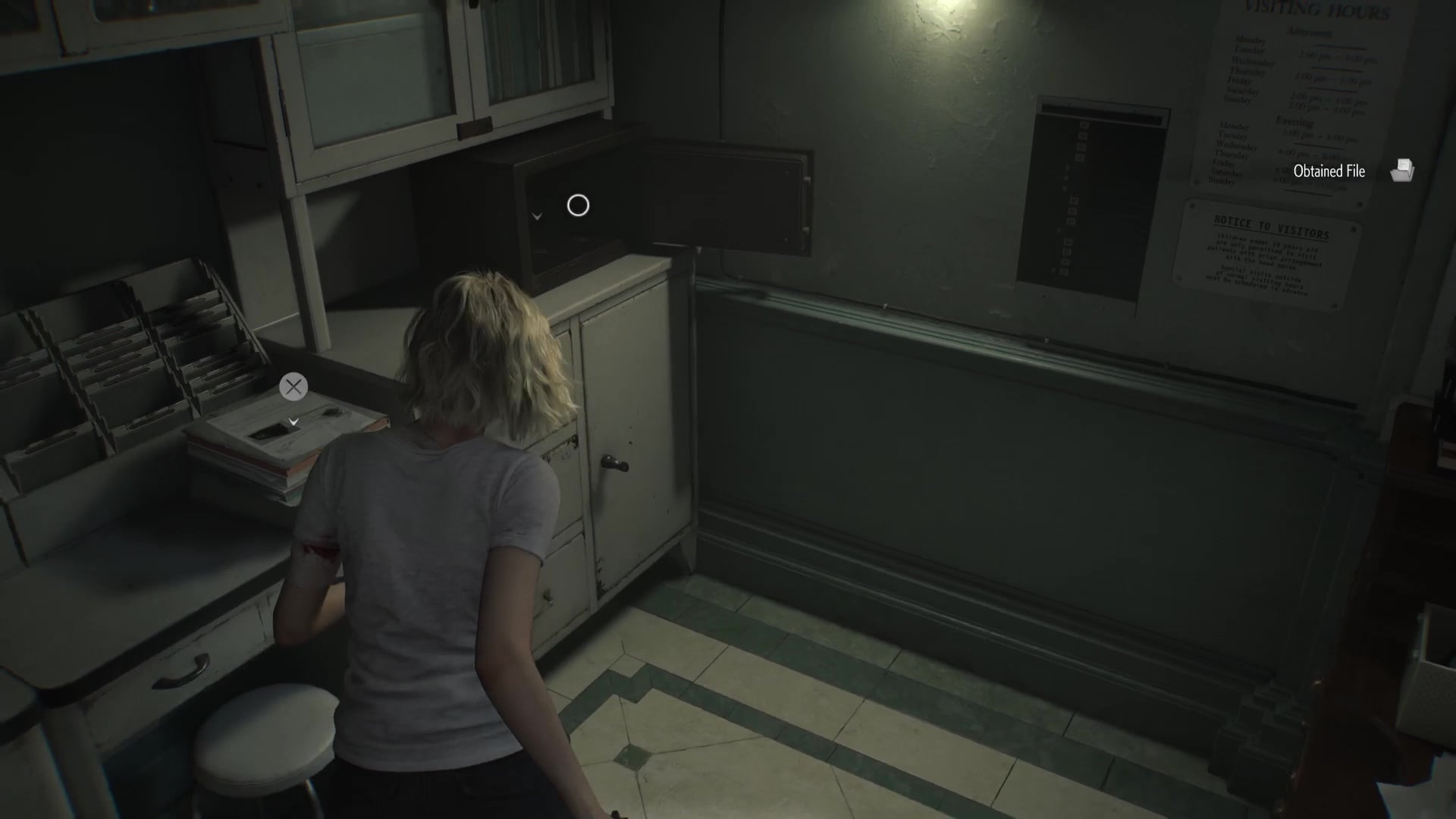 There’s another safe behind the desk in the Waiting Room, but this one is actually already open.
