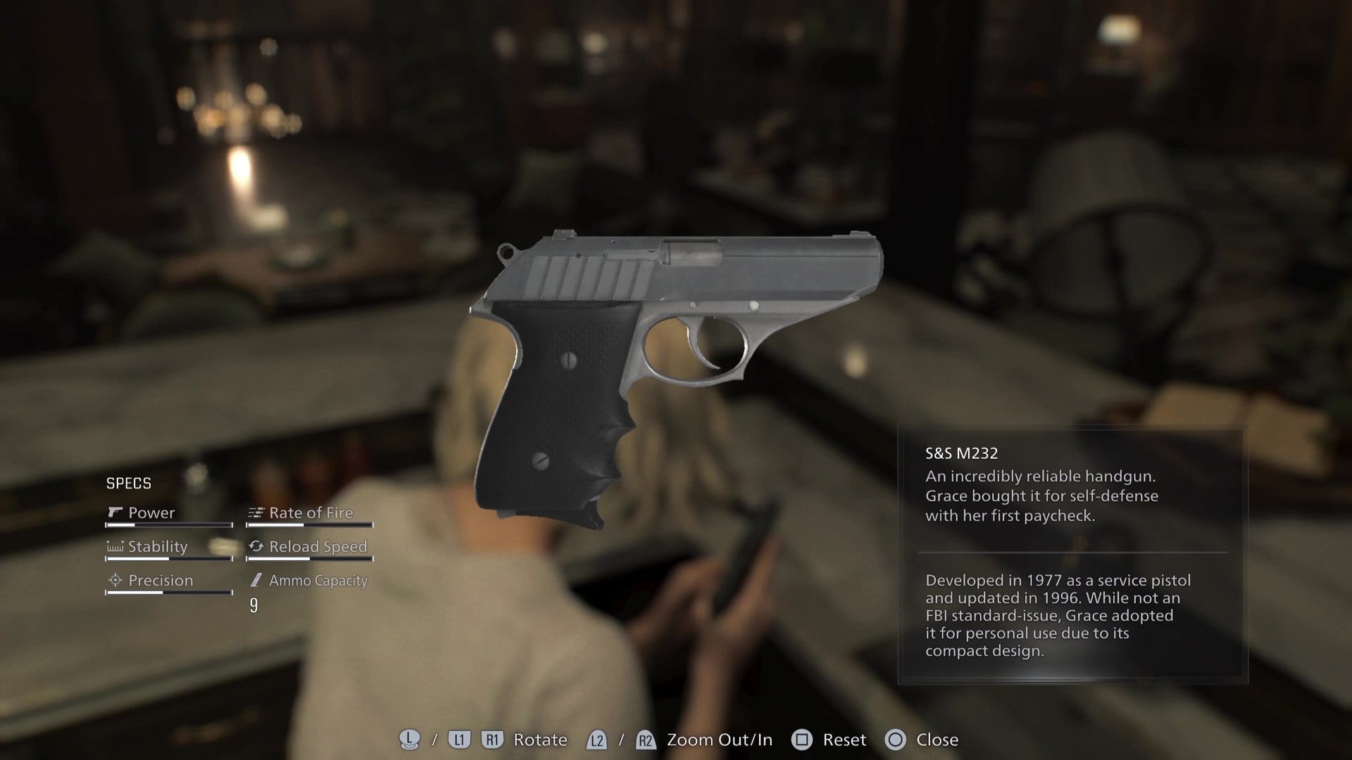 This is Grace’s own pistol, which was taken from her during the intro. It’s lying on the bar in the Bar & Lounge, just upstairs from the Dining Room, right next to the Bar & Lounge safe. It is also a handgun that uses the same ammo as the B934, but it has slightly more firepower for taking down pesky zombies.