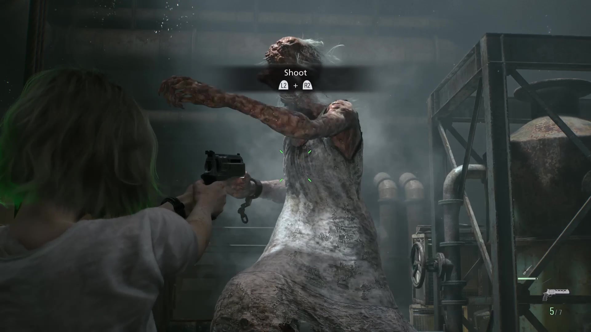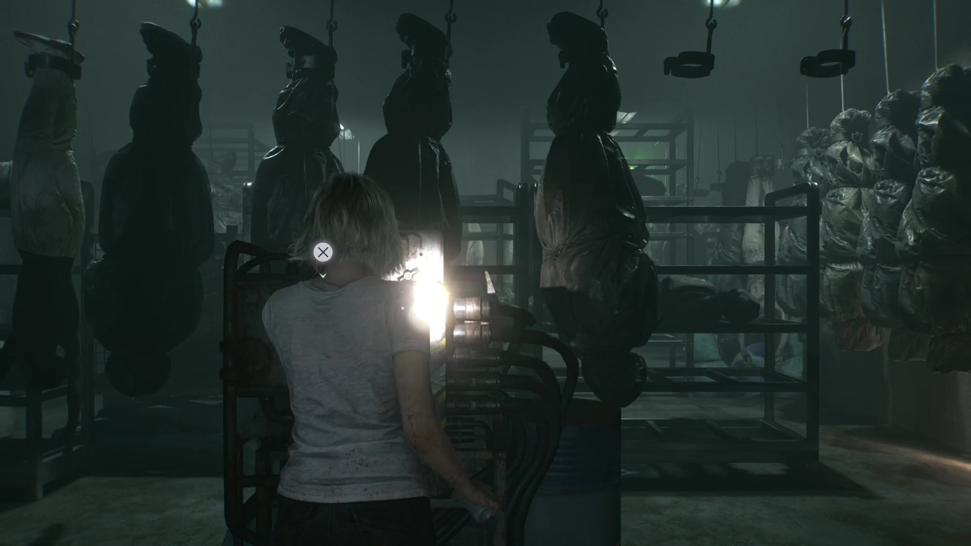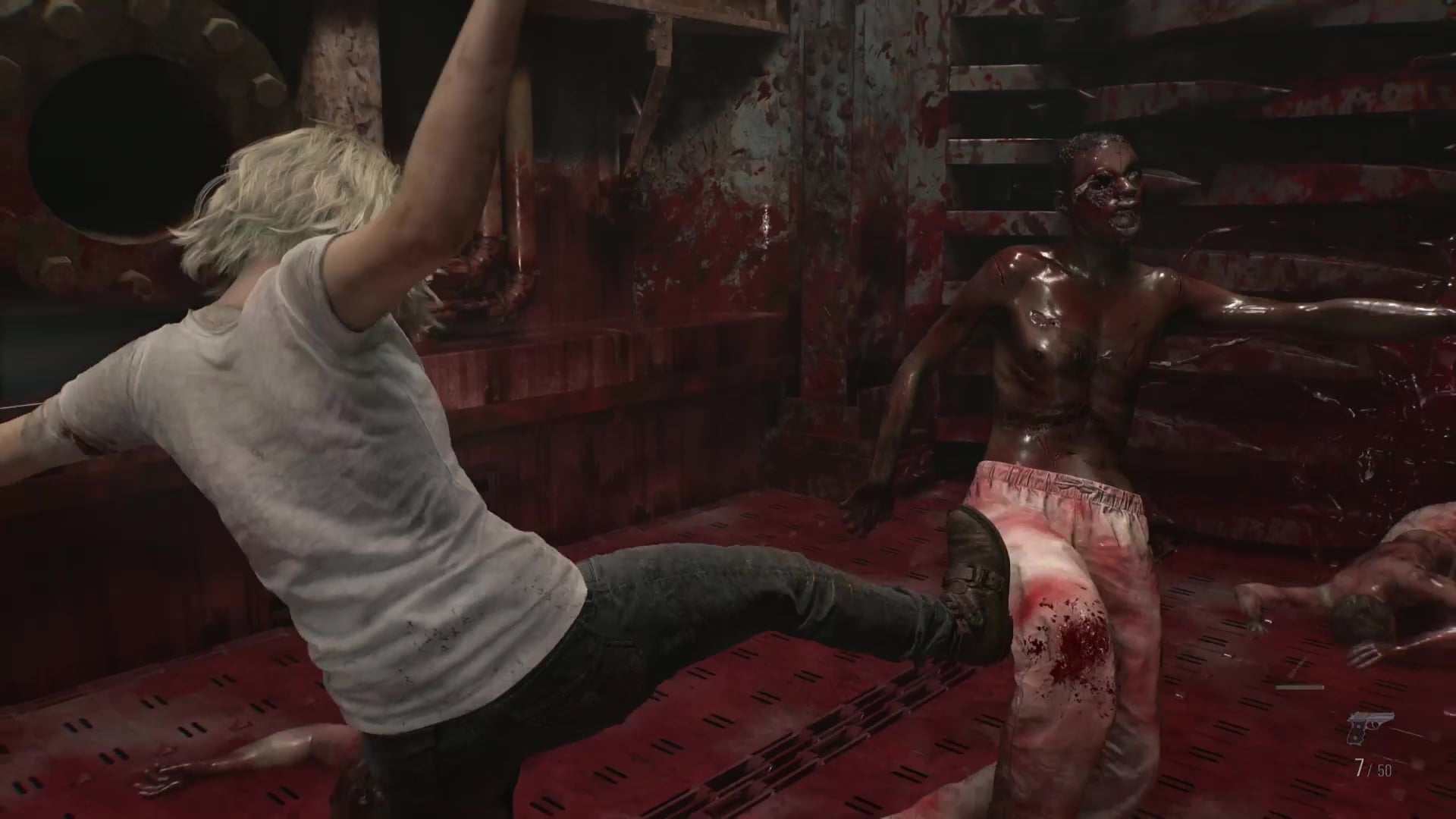 Once the lights are on and you’re in the Inspection room, you’ll have to move around the room along with a bunch of body bags, occasionally reversing their direction to get to new places. Just wait for large gaps to appear in the rows of body bags, or some of the hanging zombies may grab you. You’ll eventually make your way through to the other side of the Processing room. Turn the wheel to drain the pool, get ready for combat, and climb down into the empty pool. We recommend shooting them in the knees and kicking them toward the rotating blades.