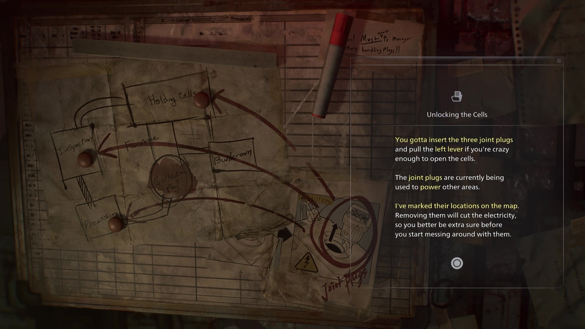 Place both Joint Plugs in the Collection Pool socket, and this will activate the lights and open a door at the end of the room. You’ll have to crawl through some vents to make your way through to Processing, and you’ll find the Forklift Key in this room on the floor. Use it on the nearby Forklift to open the main room, where you can find a map and some instructions.