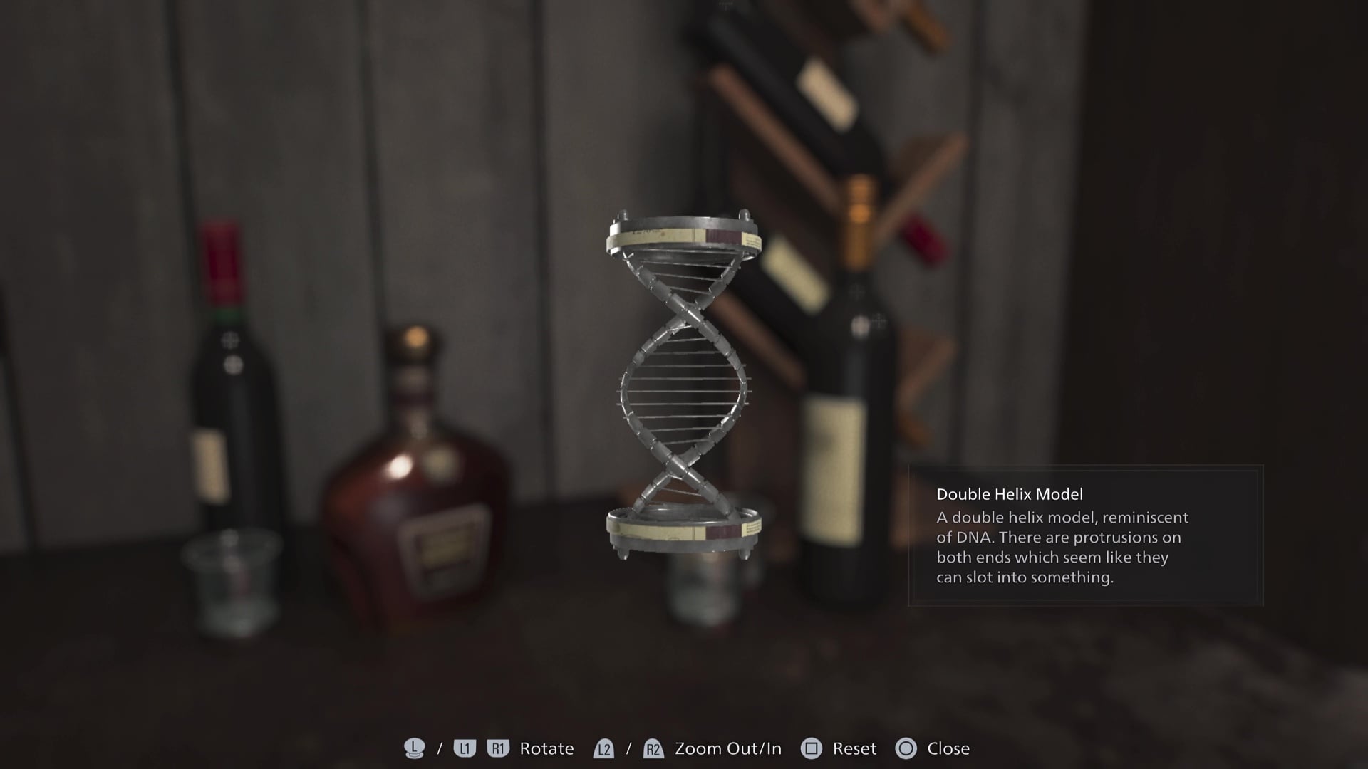 Inside the Visitor Building, things get weird. Inside the large office room at the back, there are several objects you can interact with and examine, but the main one we want is the wine bottle on the left side of the room as you enter. As you examine this wine bottle, you will be able to rotate it, finally unveiling a Double Helix Model.