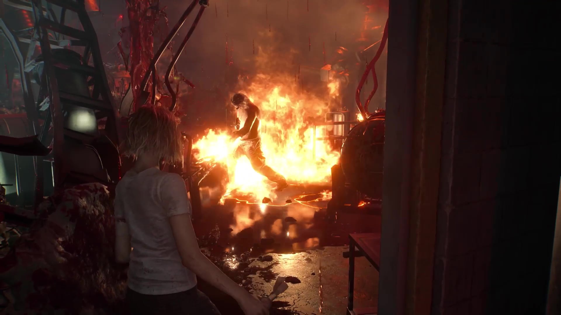 Once you finally make your way across the Collection & Testing room and up some very bloody stairs, you’ll emerge outside in the Courtyard again, just in time to see Harry fighting off zombies.