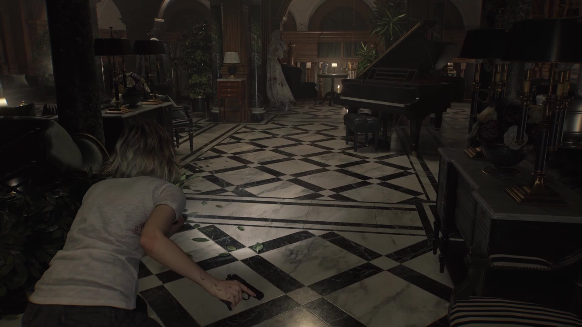 At the end of the hallway, past the Dining Room, you’ll find the Cold Storage door, but it will immediately snap off the turnwheel handle if you try to open it. Instead, take the stairs to the Bar & Lounge above the Dining Room — if you’re feeling brave, there’s a pistol behind the Bar for you to take, the S&S M232, Grace’s own pistol that she lost.