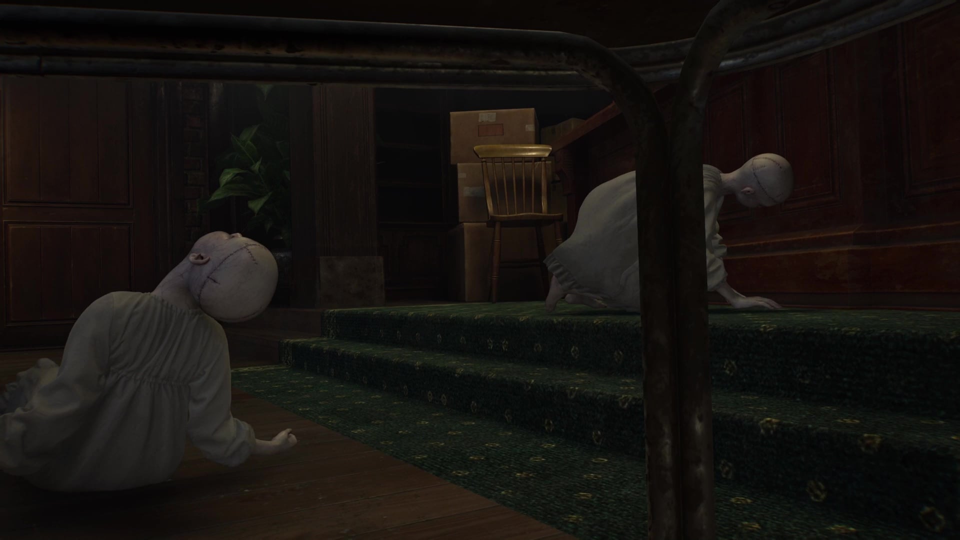 When you’re able to leave your hiding spot again, head through the door in front of you until you encounter two girls in the hallway. When you see them, run back to the atrium near your hiding spot, and then turn around and run back down the hallway to find that the girls are gone.