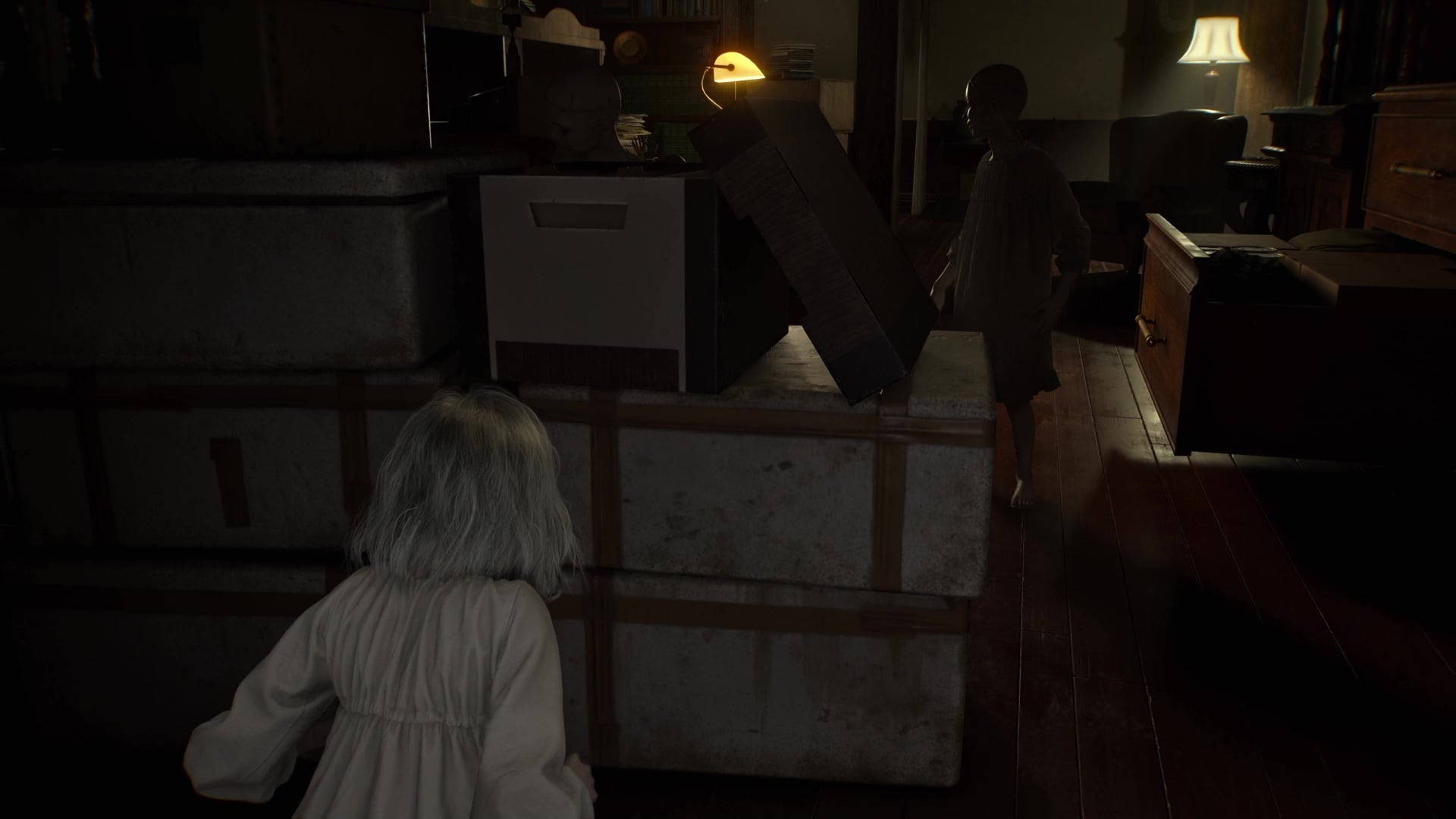 In the next room, turn on the lamp and pull out the drawer to reach the key on the hook. When you approach the floor hatch to unlock it, the girls will appear again. Run back toward the drawer you pulled out, and crouch down behind the boxes here. Wait here until the girls leave, and then unlock the floor hatch to escape.