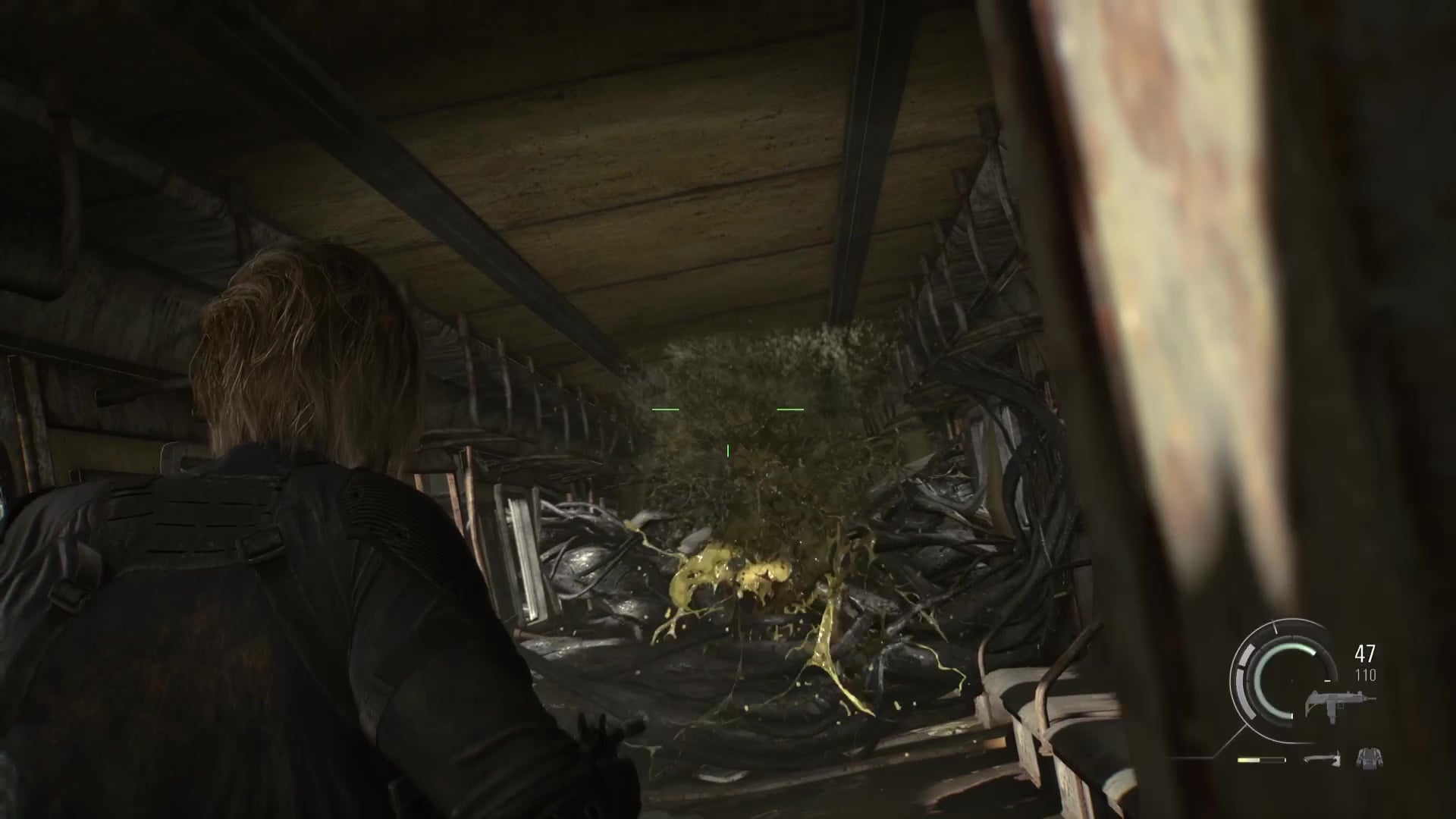 You’ll encounter yet another ruined subway tunnel, along with a train suspended over a large chasm. As you make your way through the train, you’ll be accosted by large, plant-like tendrils with flowers that you’ll need to shoot out. This’ll make the train collapse, however, plunging Leon into his next challenge, Plant 43.
