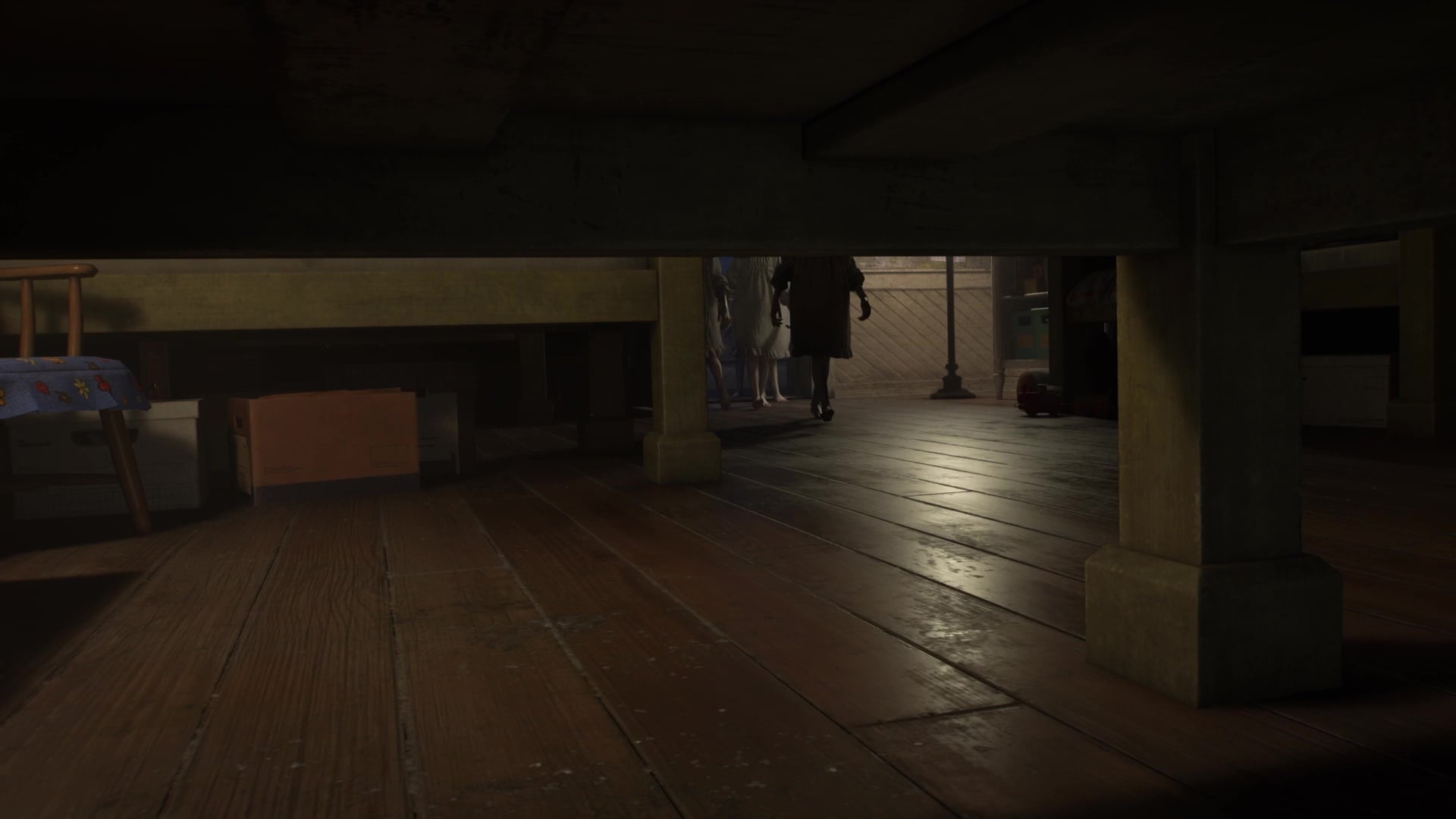 After the girls leave and you’re given the option to leave the bed, head through the room you saw the cutscene in and downstairs into the Orphanage’s atrium. Down here, hide underneath the table on the right side of the room at the rear.