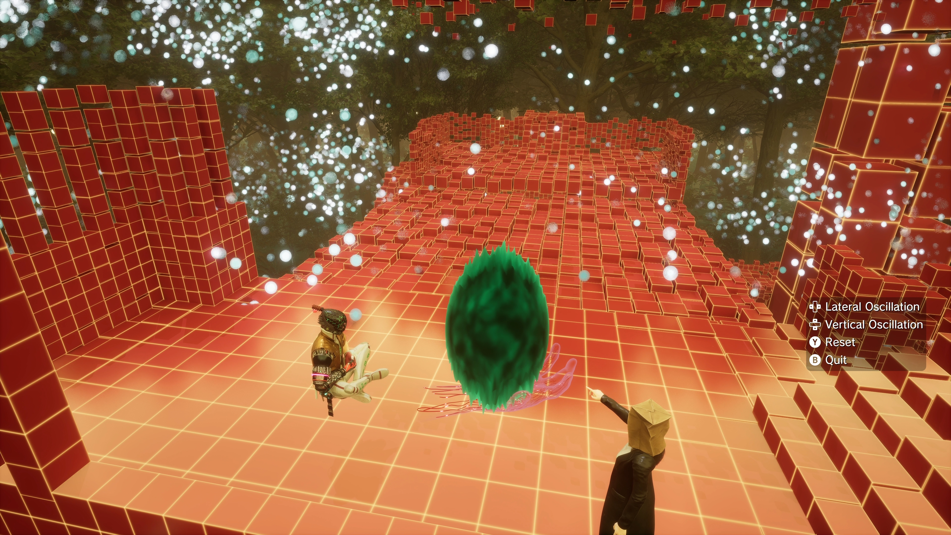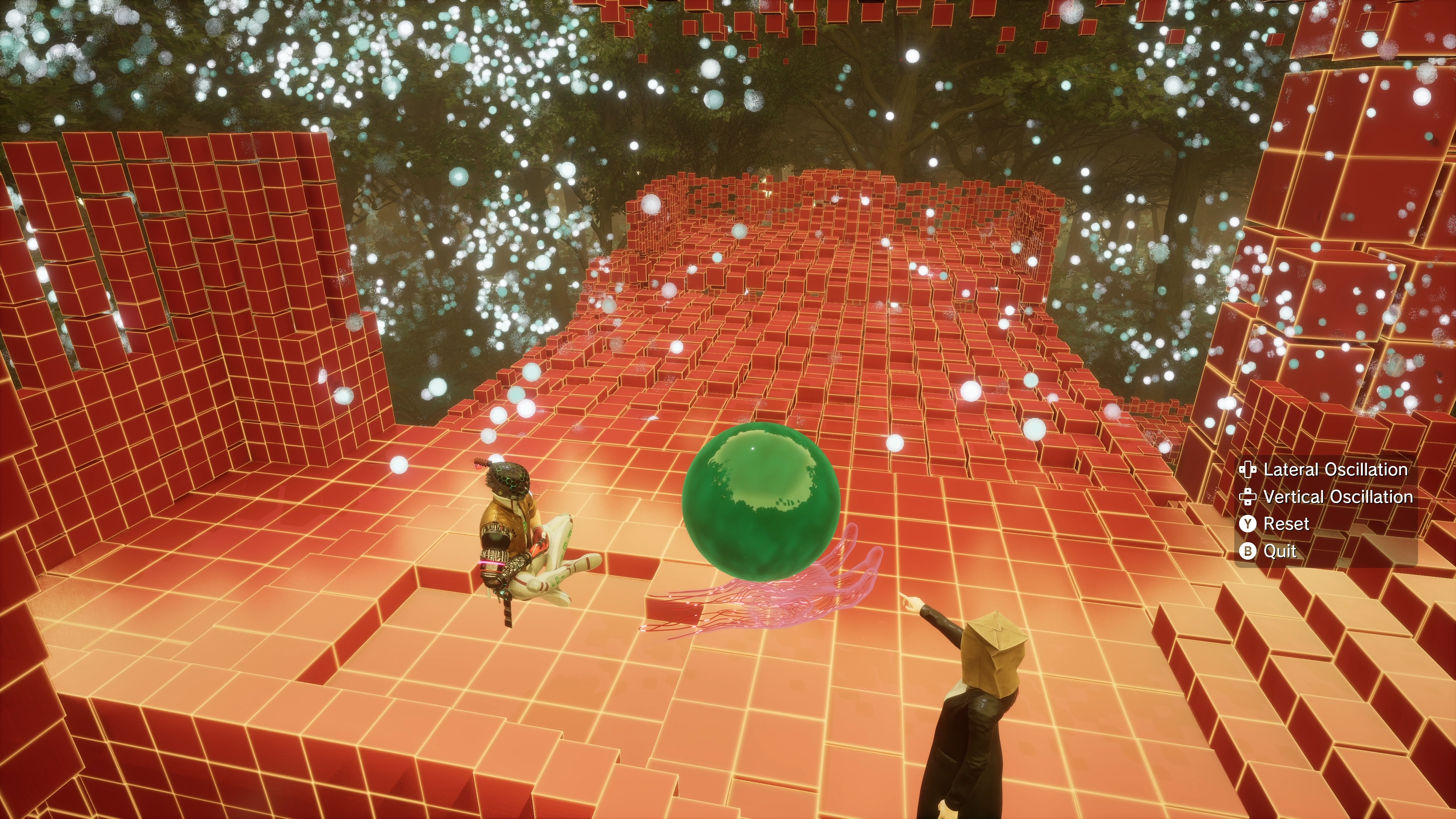Most players, then, will find themself sitting in front of a fuzzy green ball with the commands Lateral Oscillation, Vertical Oscillation, Reset and Quit.