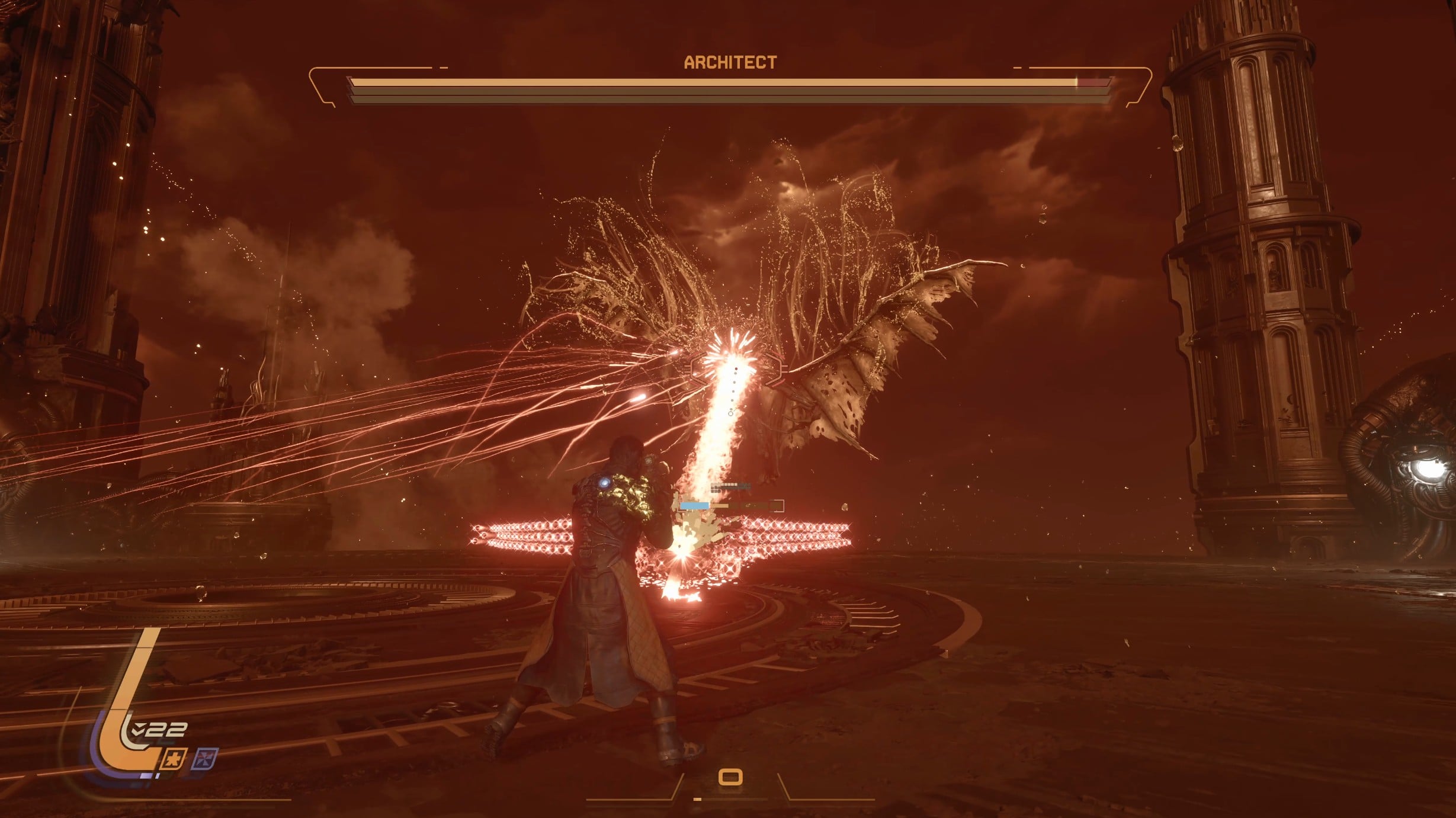 - In phase 1, Architect will fire a beam of red projectiles that you should parry back towards it.