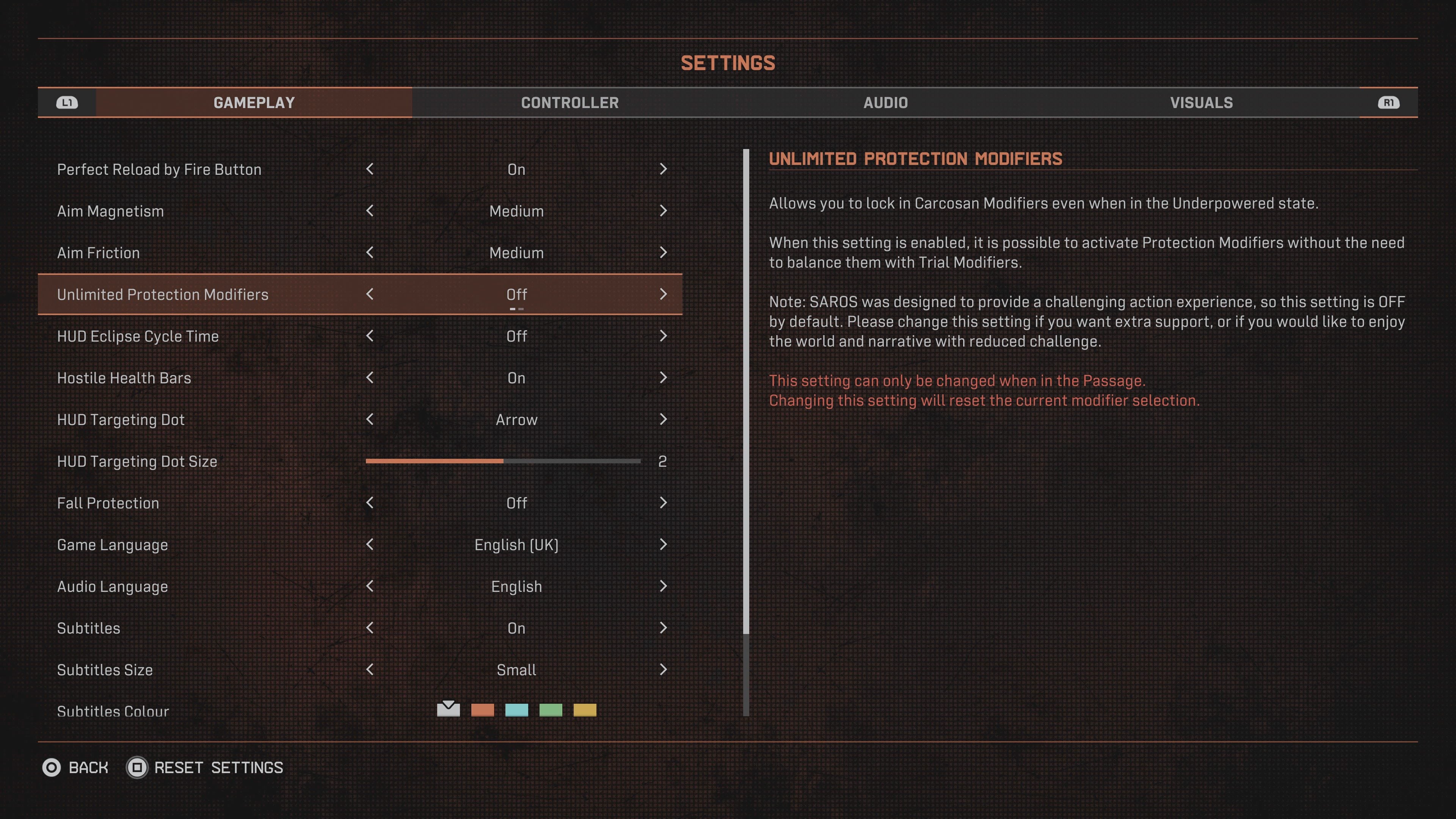 If you’re still finding Saros too tough, there is a further option. In the game’s settings menu, head to the gameplay tab and then go down to Unlimited Protection Modifiers. Via this option, you can add as many protection modifiers as you want, without the need to balance it out with the corresponding trial modifiers.