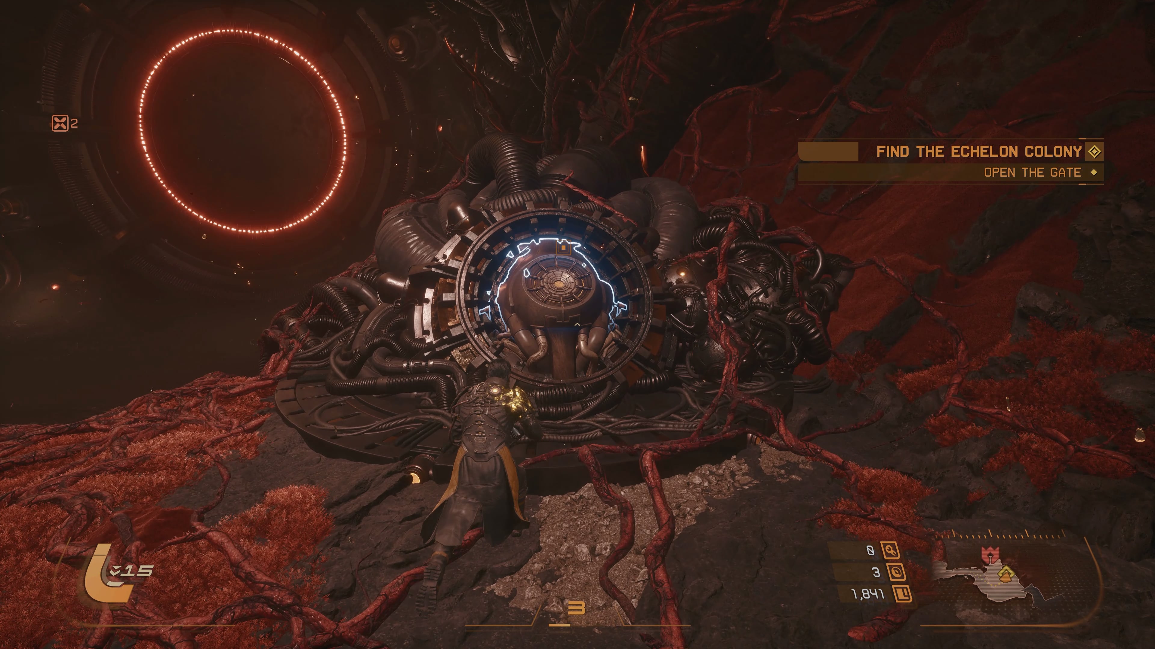 At the end of that corridor, you’ll have a big button to interact with that will restore the power to the gate. Once you’ve done that, proceed forward to the next area and you’ll find a teleporter that will bring you back where you started, where you can now open the gate and reveal the first boss in Saros.