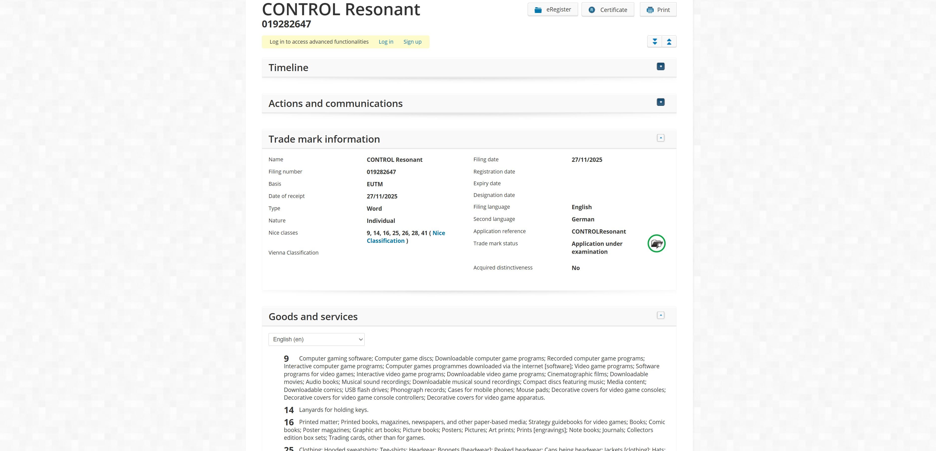 Although the word Control could be trademarked for any number of things, this particular trademark was filed under the typical categories most video game related trademarks are filed under, most notably the category which includes “computer gaming software” and numerous other forms of digital entertainment.