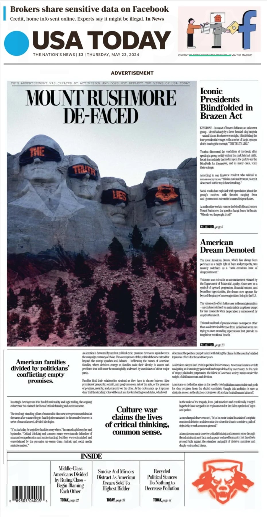 The same image of a vandalised Mount Rushmore that is advertised in USA Today also appears in the video.