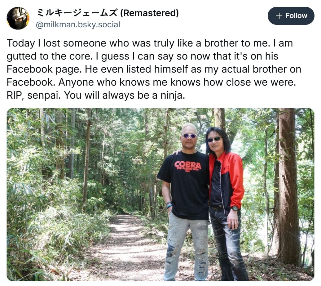 “Today I lost someone who was truly like a brother to me,” Mielke wrote. “I am gutted to the core. I guess I can say so now that it’s on his Facebook page. He even listed himself as my actual brother on Facebook. Anyone who knows me knows how close we were. RIP, senpai. You will always be a ninja.”