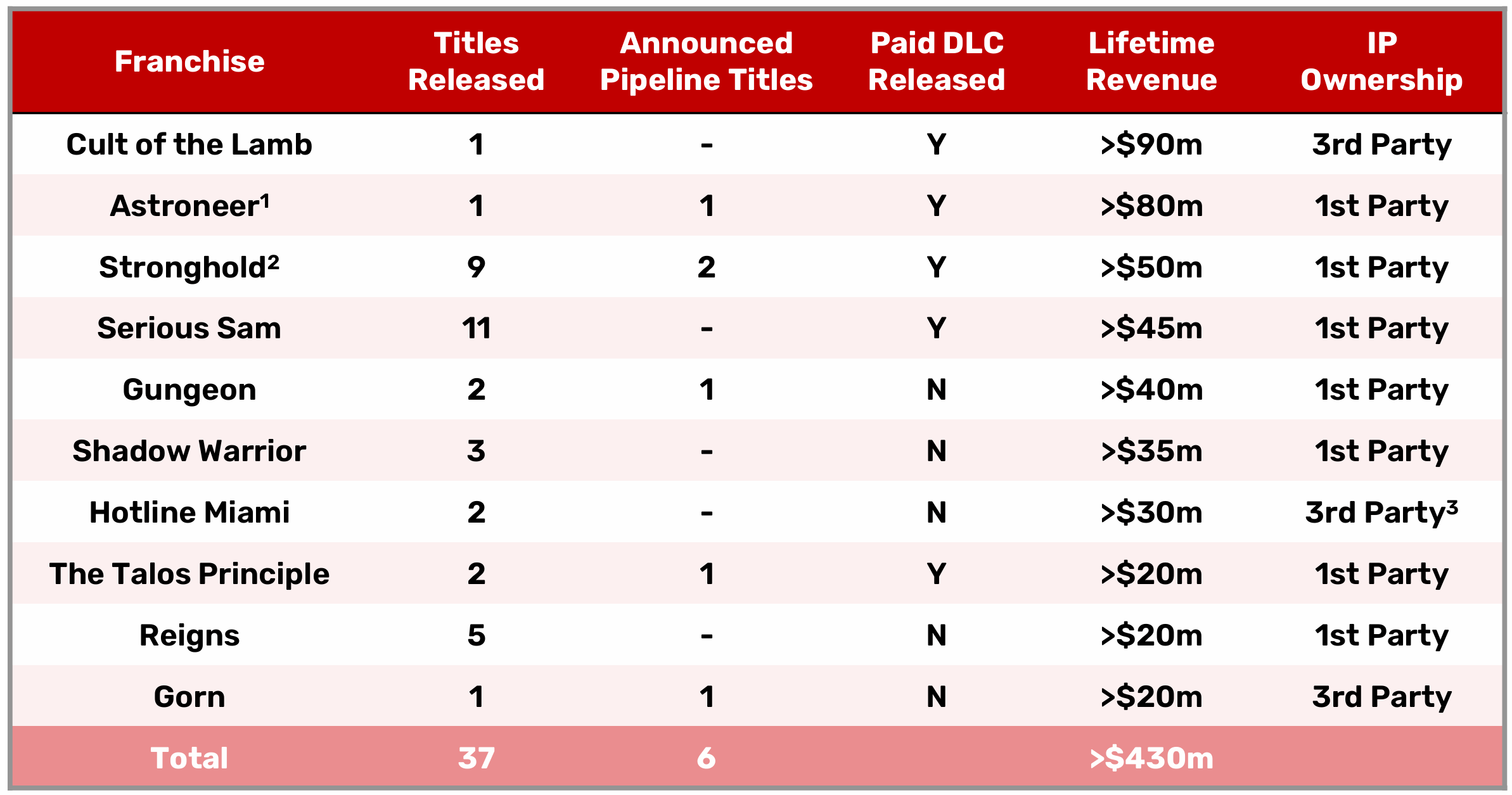 This is followed by numerous first-party IP, including Astroneer ($80 million), Stronghold ($50 million across 9 games) and Serious Sam ($45 million across 11 games).