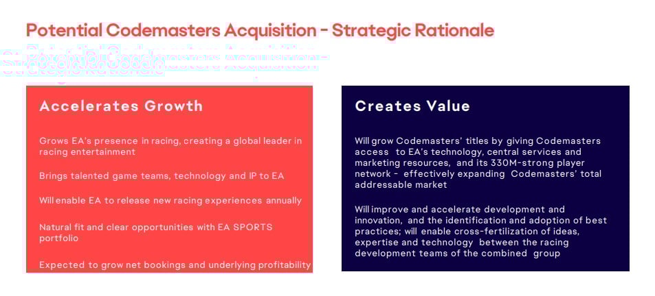 Electronic Arts has said its pending acquisition of Codemasters will enable it to release racing games on a yearly basis.