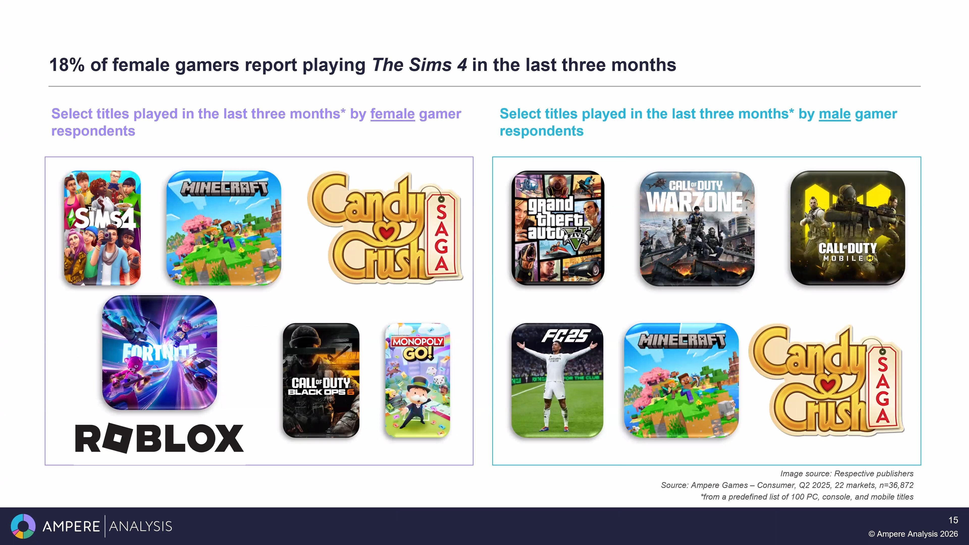 The company’s research found that women tend to prefer narrative-driven, single-player experiences over competitive multiplayer games, with 18% of those surveyed saying they played The Sims 4 in the last three months.