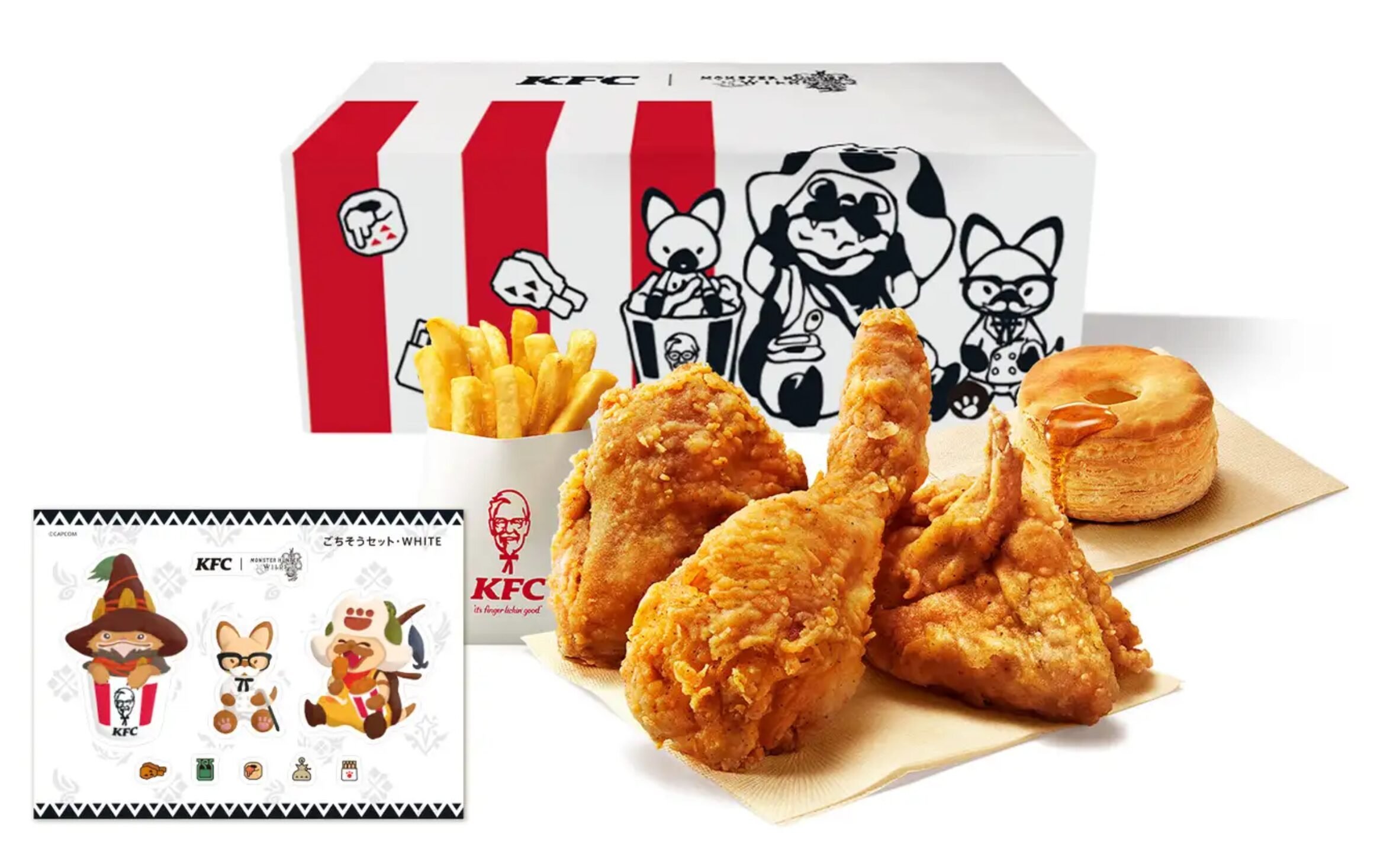 Both sets come in standard meals – two pieces of chicken, biscuit and small fries – and larger meals which include an extra piece of chicken and a collaboration sticker sheet too.