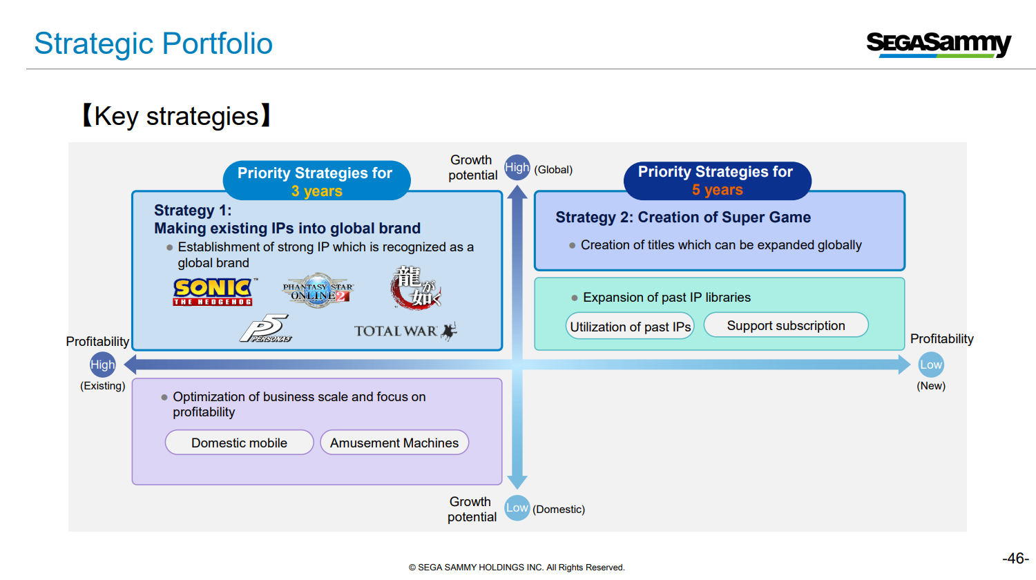 This includes a five-year strategy called “creation of Super Game”, which Sega suggests will start off with low profitability because it’s a new IP, but has high growth potential because it will be sold globally (as opposed to its domestic mobile and amusement machines).