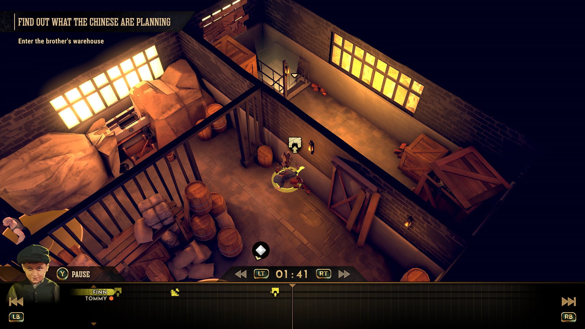 But progress requires teamwork. The trick is that you can stop time, rewind and switch characters at any point, in order to synchronise their actions. Perhaps Tommy needs to move through the streets unseen, so you first position Ada to distract a sentry for a few seconds, then rewind to just before the distraction so you can guide Tommy through the danger area at the right moment.