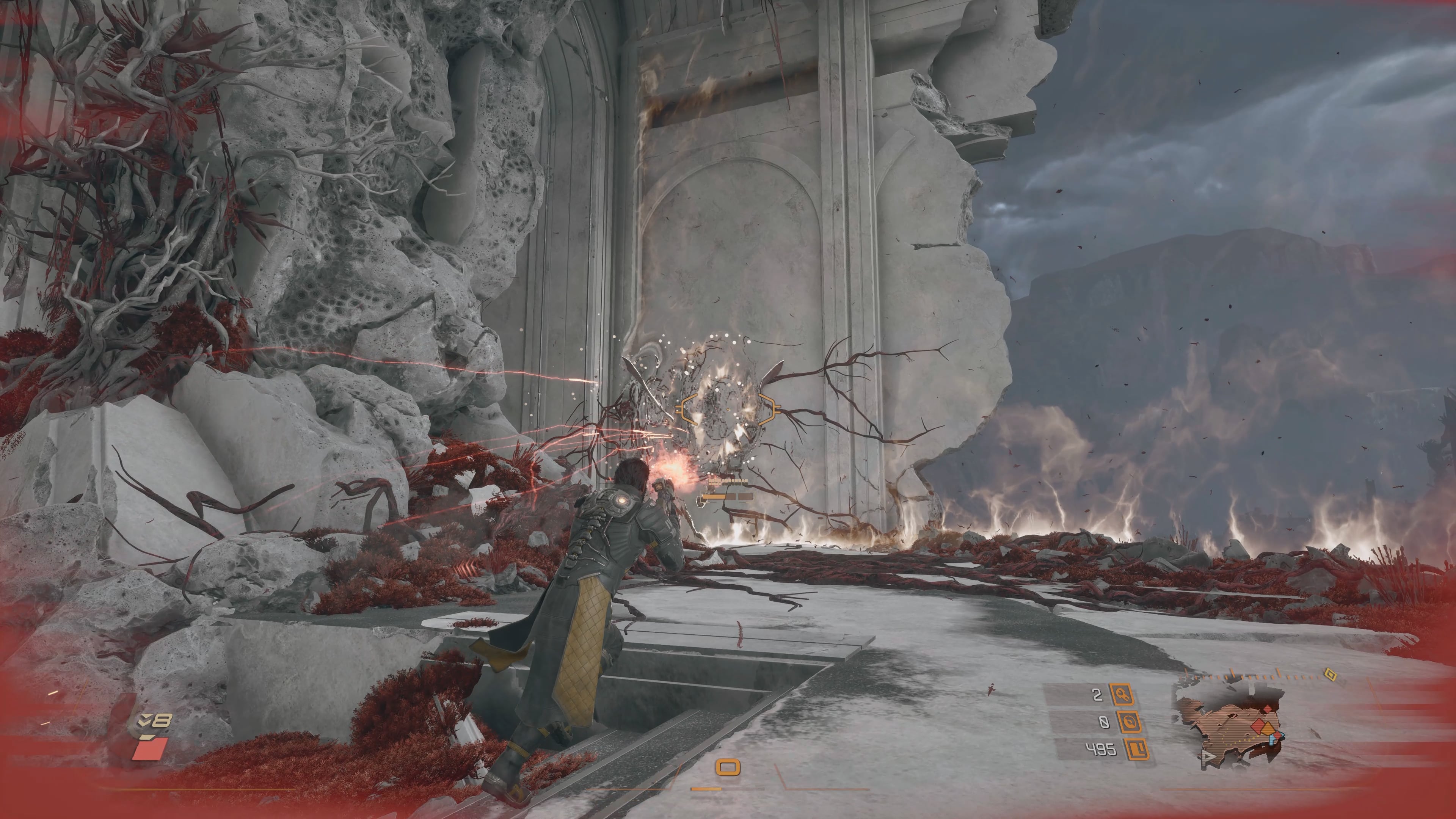 In what the game’s director, Gregory Louden, describes as the “bullet ballet,” Saros allows the player to absorb enemy bullets to convert them into a powerful weapon. Blue bullets can be absorbed, yellow ones can be dodged through, and red ones can be parried.