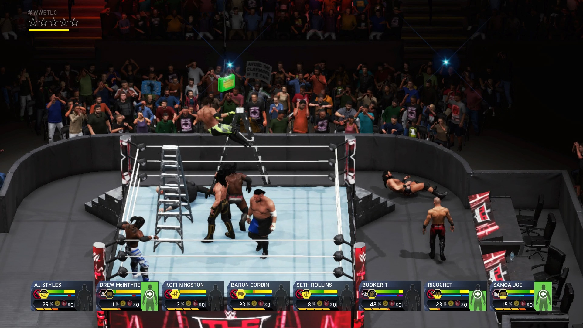 That’s not to say we haven’t had our fair share of issues, of course, and while most are fairly minor compared to the more viral examples, they’re still evidence of an extremely sloppy product. Lighting is often a mess, with odd strobe and dithering effects passing over wrestlers during close-ups. Objects like ladders and chairs twitch around when dropped and continue to have wild spasms until they can find a place to rest.